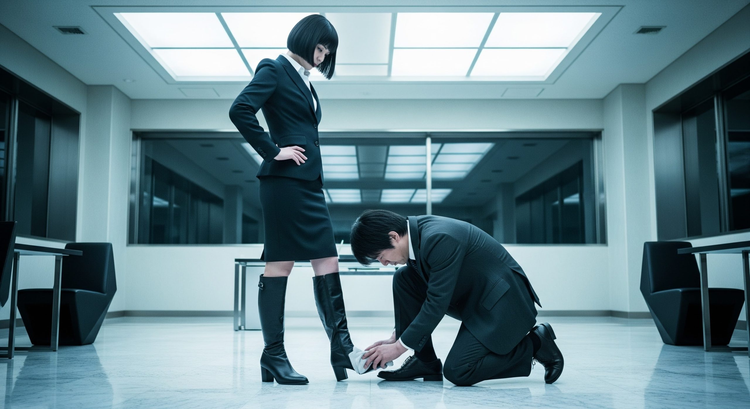 彼女の前に呼び出され、冷たいデスクの前に跪く。これは「指導」という名の処罰だ。